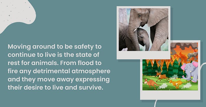 As we move up the evolutionary ladder and see the animal world, the will to live and procreate is the new activity we find . Moving around to be safe to continue to live is a state of rest for animals.. From flood to fire any detrimental atmosphere and they move away manifesting their will to live and survive. This will to survive is not there in the plant kingdom.